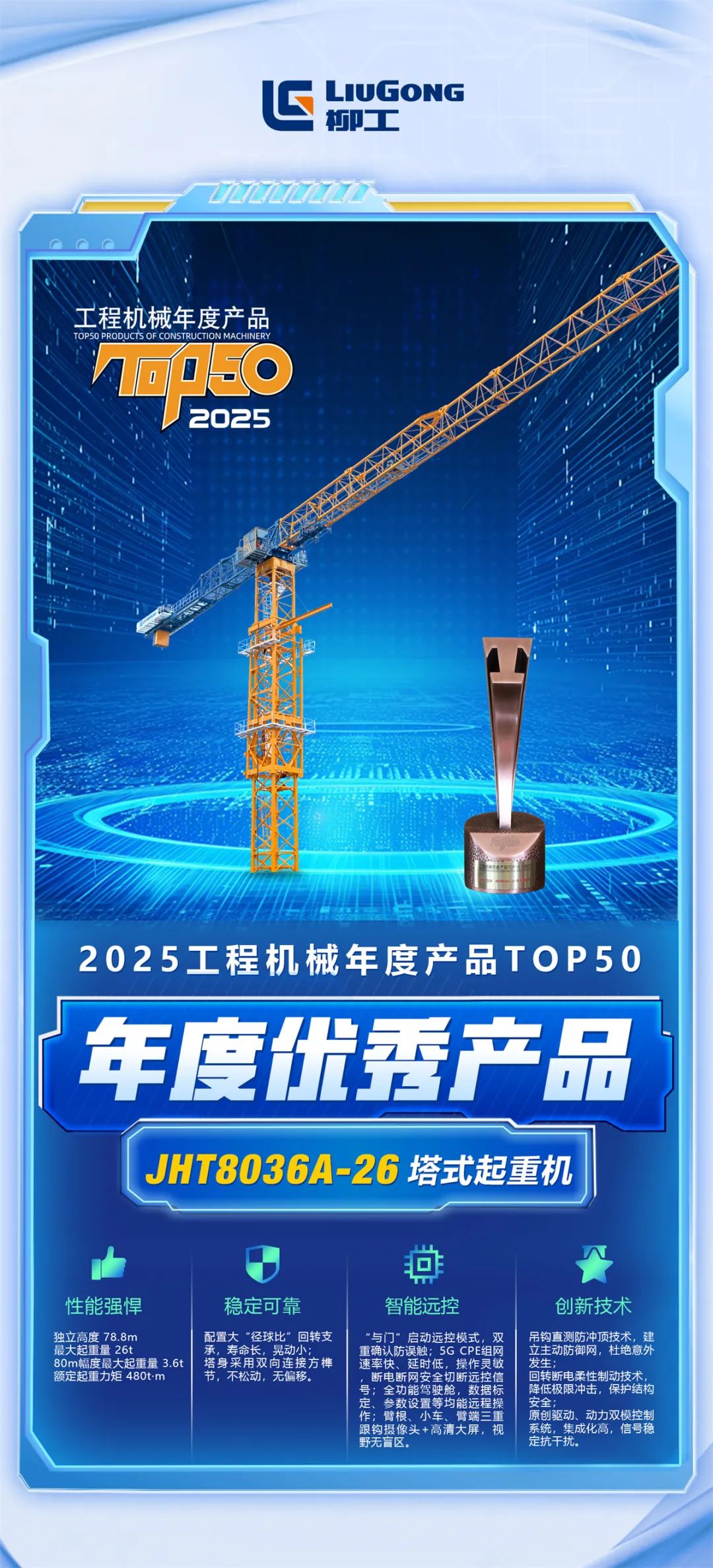 創新吊鉤直測防沖頂技術、回轉斷電柔性制動技術,安全性更高;原創驅動、動力雙模控制系統,集成化高,信號穩定抗干擾。以性能強悍、穩定可靠、智能遠控等優勢贏得施工方高度認可。